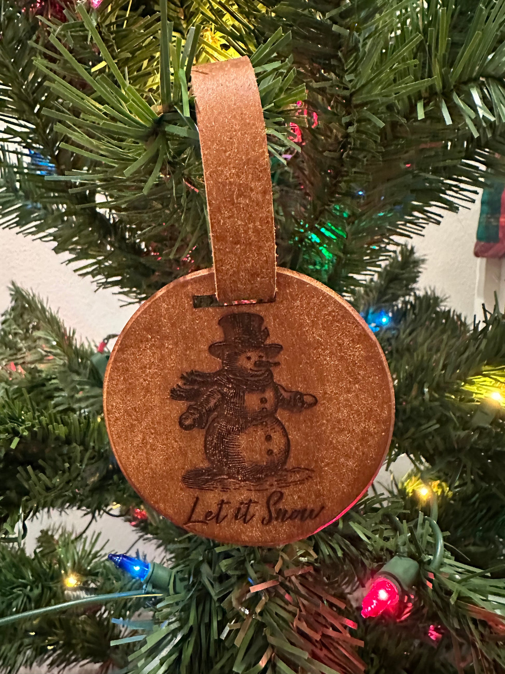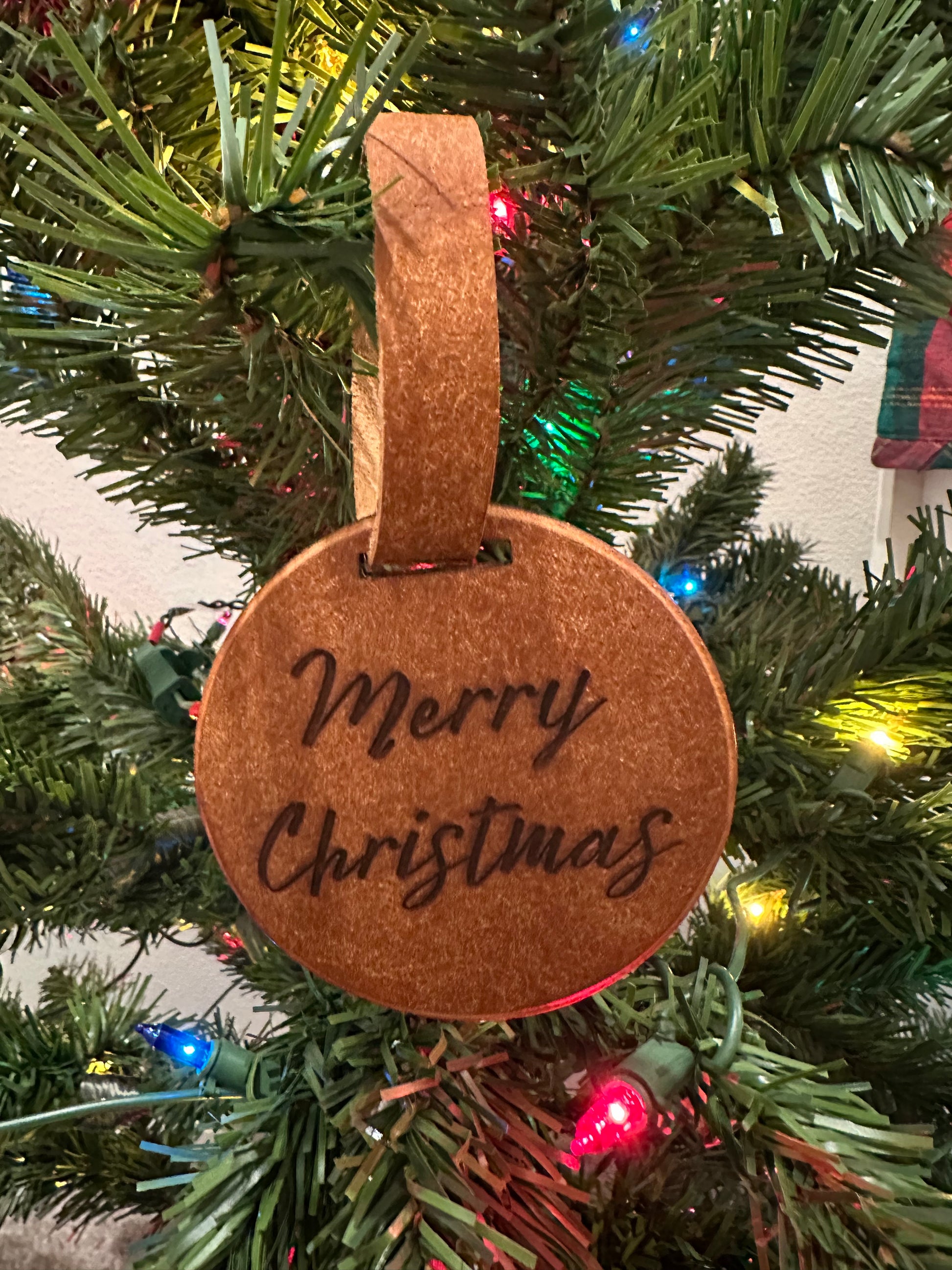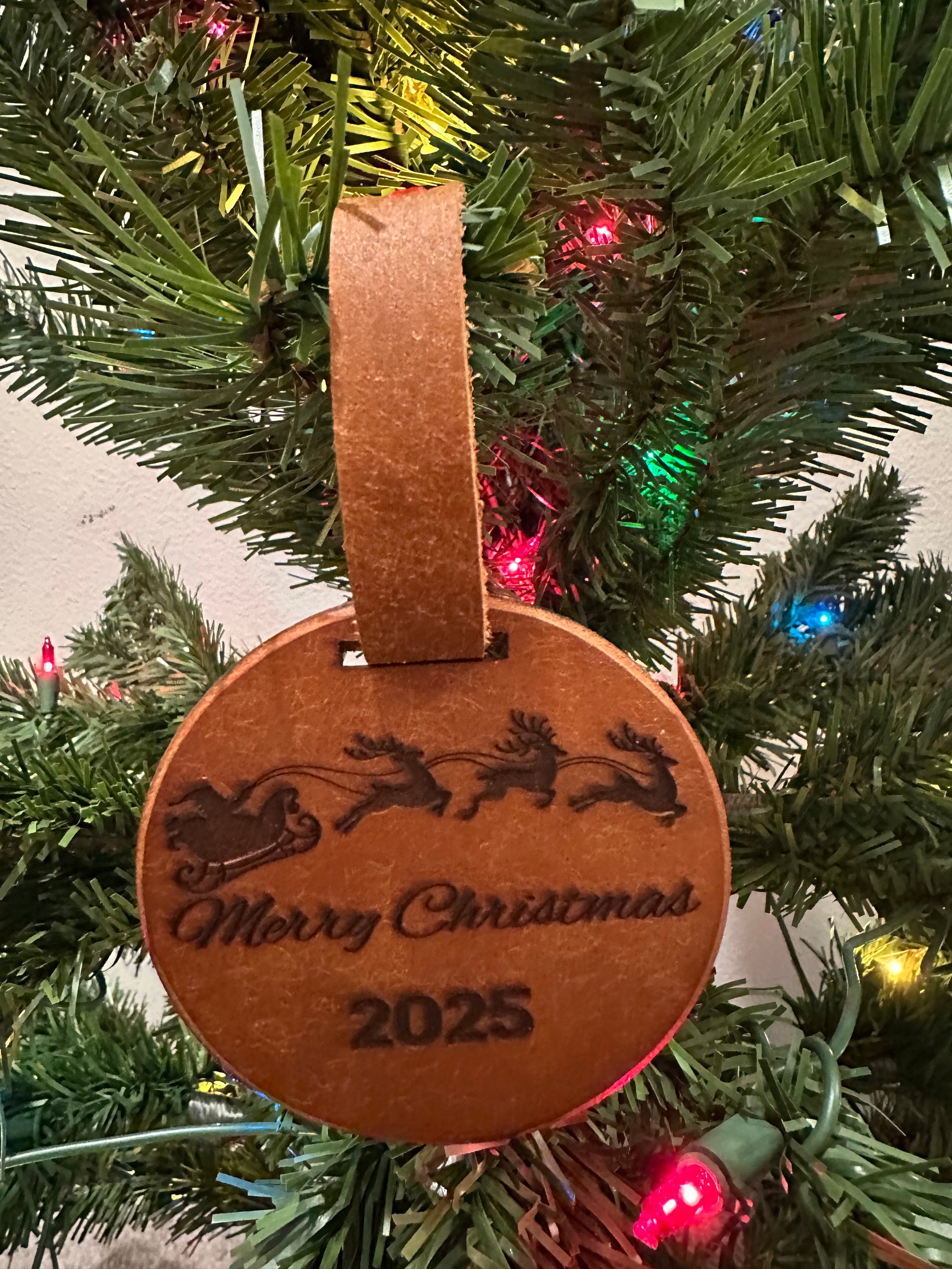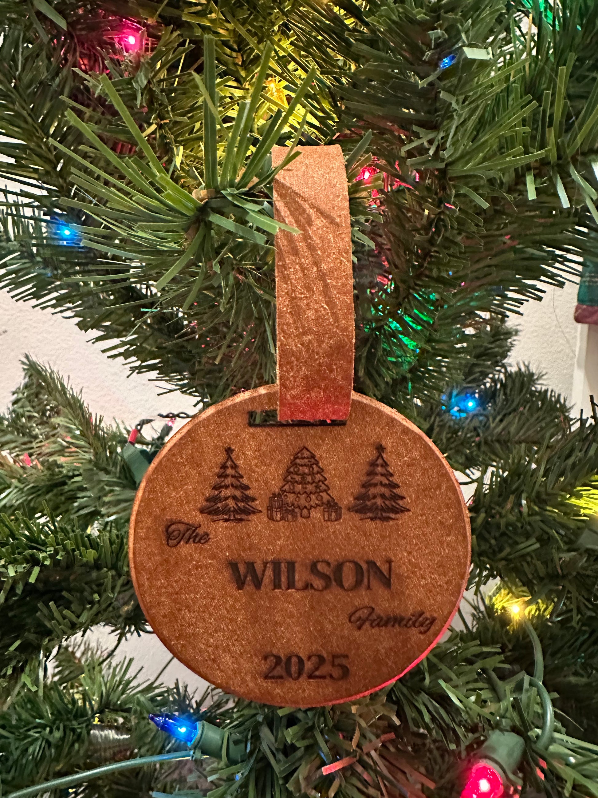 "Home for the Holidays" Christmas ornaments are a special way to add some personal flair to your Christmas tree this year. These ornaments are 3" rounds with a leather strap hanger.
